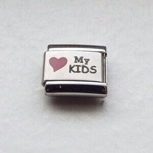 New never worn 9mm stainless steel Italian charm bracelet link with a red heart My Kids lasered on it.Fits all standard 9mm Italian charm bracelets.Thanks for looking!