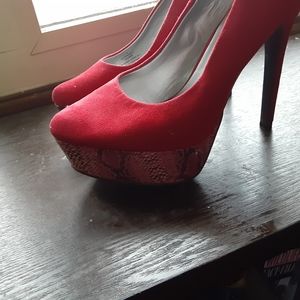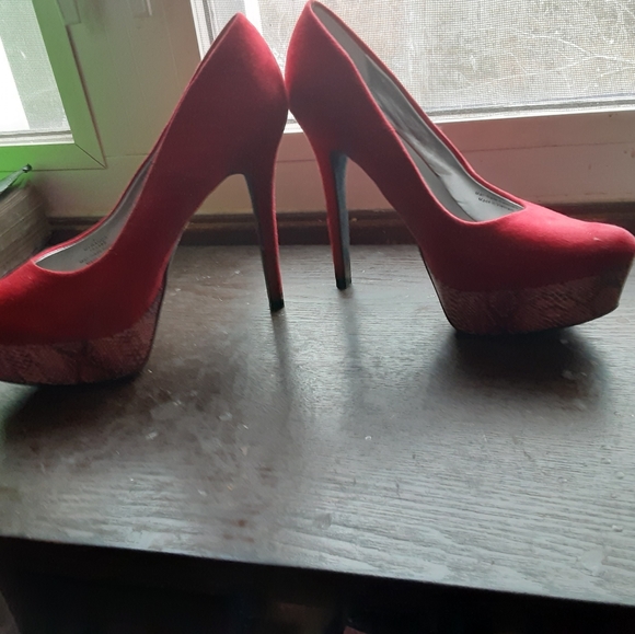 Beautiful faux suede or velvet like red material. Platform red/ pink snakeskin print. Adorable for valentines day