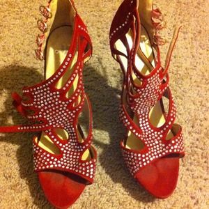 Red high heels with diamondy-looking accents. 4 straps. Stiletto style shoe. Open toed. Beautiful. Have been worn, and have wear markings, so I'm knocking an extra $5 off.