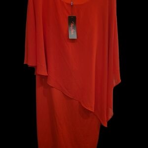 Beautiful red hot dress sleeveless underneath with an asymetrical mesh poncho over! zips up the side NWT size 16. also available in black and in pink!