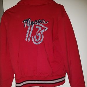 Slightly loved ,red letterman styled jacket. The cuffs& bottom waist of the jacket has red,black& gray stripes going around it.
