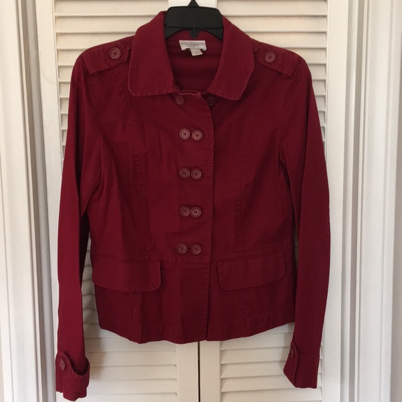 Cabernet red light weight jacket/blazer. Great button details. Cotton spandex. Machine wash and dry