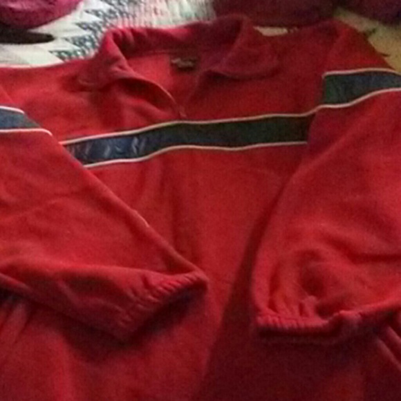 Cozy red jacket with blue stripe across chest and arms, pockets