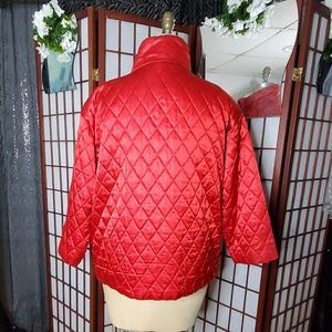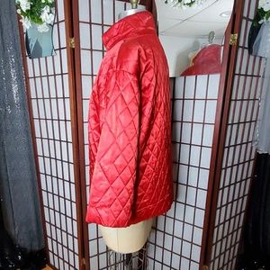 Red lined jacket. Front zipper. Side pocket. Shoulder pad.