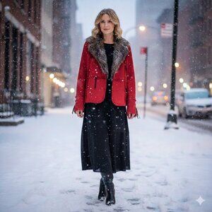 Snuggle into this fashion forward jacket for all your winter events, dances and/or football games. Think Santa and his elves on horseback. Red faux suede with faux coyote fur collar and cuffs. Inside is a soft velour fabric. Accented with black buck-stitching, ties and flower details at cuffs. Toggle closure with inside button for security. 2 side pockets. This will really make you stand out at your winter holidays. Great for photos too. **Hard to find size for curvier girls.**
