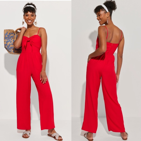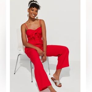 Red jumpsuit with tie front and cute pom trim. Zipped back, rayon polyester blend, machine washable, never been worn ♥️