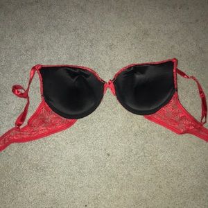 Red lace bra with black underlay.