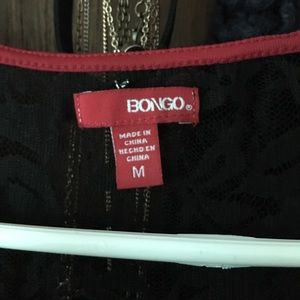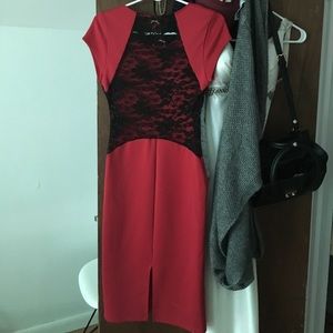 A medium red dress with black lace fabric on the back and on the sides waist up with a small slit at the back of the dress at the bottom. Never worn.