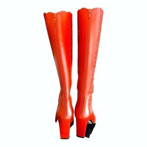 Absolutely fabulous boots, amazing condition barely worn, scalloped top, lazer cut lace design, back zipper, nicely fitted, very sexy. Size 6.5, heel 4”, heel to top 18”. Please see all photos for full description.