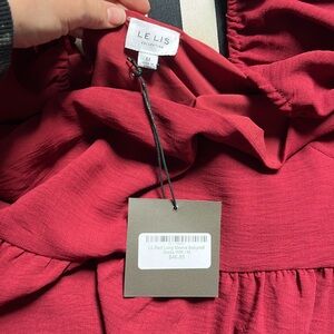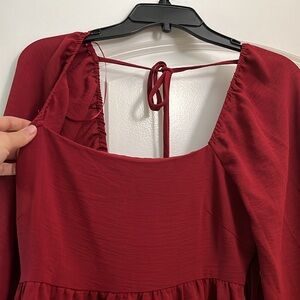Maroonish-red long sleeve mini dress. Never been worn still has tags. Square neckline with tie in back. Elastic sleeves. I’m 5’2” and it hits just above my knees.