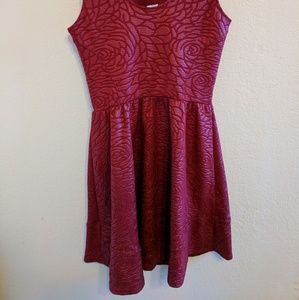 Faux leather look for a stretch red dress with rose pattern imprint 🌹 easy to dress up or down 🌹 Red is THE color this season and this wine-red dress is great for layering