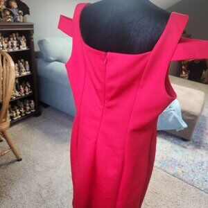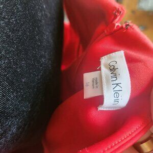 Red off-the-shoulder Calvin Klein cocktail dress, stretchy scuba material
