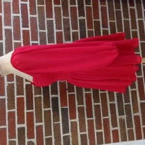size 8/10 red party dress low cut front zip closure. has slip underneath long sleeves sheer. material is not stretchy.