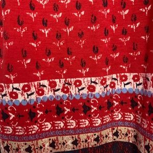 Red shirt with white and blue pattern