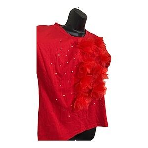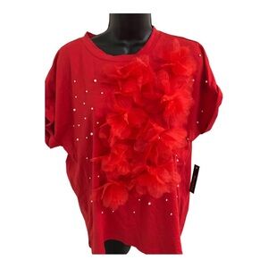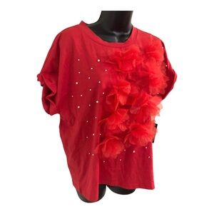 Red pearl adorned 3d floral embellished short sleeve shirt top size XL new