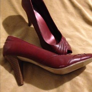 Dark red heels in excellent condition. The brown heel on these beautiful shoes is the perfect height and wonderfully complements the red leather uppers.