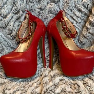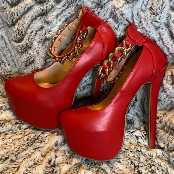 High platform heels, gold chain around ankle.