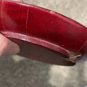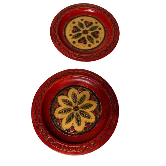 Deep Red polish old world style holiday carved wooden hanging lacquered plates with leaf and pine cone designs with gold accents. Size is @ 6.25” the other plate with the heart pattern is @ 6”. One plate that is in a flower pattern has some separation due to age shown in pic and small chip on edge. Holiday, festive, Christmas, Winter, cabin decor, decor, decorative, lacquer plates, old world, carved plates.