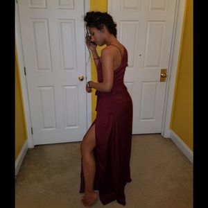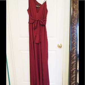 Brand new, only worn once, thick strap on one side, thin spaghetti strap on the other. Thick tie around waist. Rose gold bar across neckline. High slit on both sides. Satin-like material. Very flattering! Open to negotiate