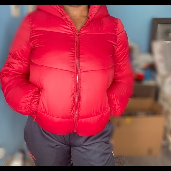 Red puffer jacket