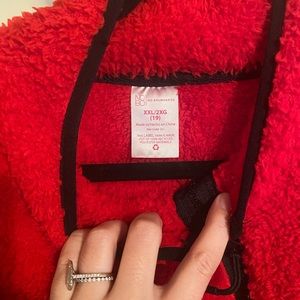 Red pullover has front small zip pocket. Fleece/teddy material. Worn once.