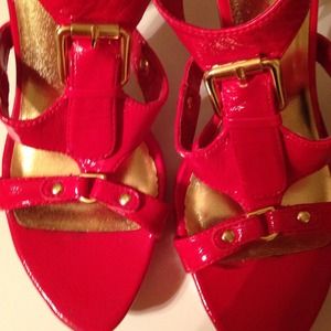 Shiny imitation patent leather heels. Gold colored fixtures. Lightly worn. 4 1/4 inch heel. 1 inch platform.
