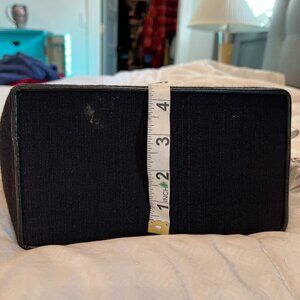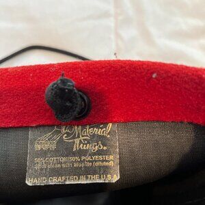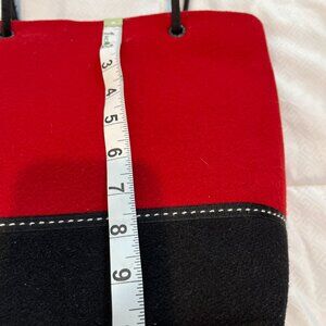 The structured red purse is 50% polyester and 50% cotton, and it feels like felted wool. Handcrafted in the US