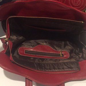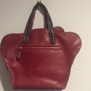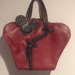 Red and black purse with black scroll design. I can’t find any name on this bag but it appears to be a quality bag. The inside looks as if it has never been used. It has feet on the bottom. Appears to be leather but since there is absolutely no tags on this I can’t assume it is. Looks like it could be a cross body bag but the long strap is missing. Small white smudge on front. See last 2 photos. Nice inlaid center zipper .