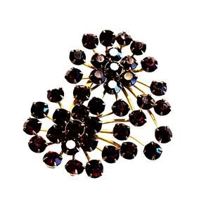Red rhinestones brooch on goldtone metal setting - this pin is a delightful double starburst design - classic vintage mid century jewelry. No hallmarks but nice quality fashion jewelry with tremendous sparkle and shine. Deep ruby red color - All prong set stones - excellent condition - ready to wear!