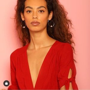 This adorable red romper comes from a store called Mulberry and Grand. The romper is slightly low cut and has three buttons down the middle with cute ties on the sleeve. The store no longer carries this item, but happy to share a full length photo with anyone who is interested.