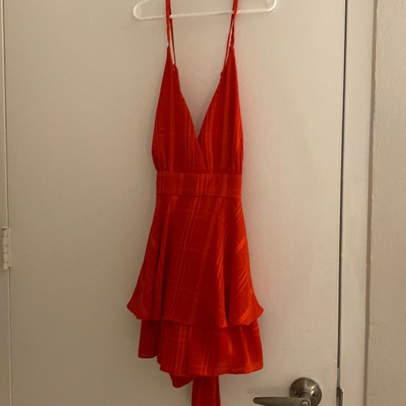 Flowy Spanish red romper. Tied with a bow in the back. Adjustable straps and zipper in back. Very flattering. No bra needed.