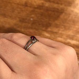 Silver/grey band with small red ruby