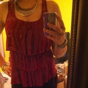 Light weight with flow so it is great for summer. Super comfy and the ruffle/mesh detailing camouflages midsection nicely (perfect if your bloating a little). Mesh has a flower & vine pattern. Hardly worn with no damage or stains. Love this tank but it doesn't quite hit the the right length for me & my longer torso.