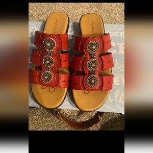 Cute little red open back sandals. They slide on easily and are super comfortable. Perfect for this summer. Never worn as they were too small of a size. Size 7 in women's.