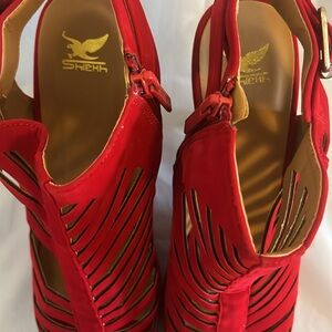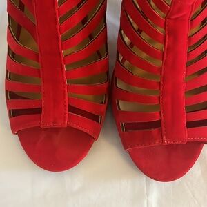 Red Suede Sandals-Size 10. Zip closure along with buckle on side. Worn 2 times. Wooden heel.