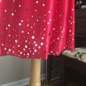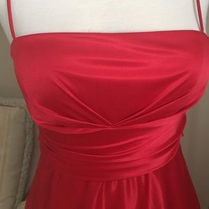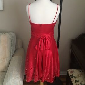 This is the perfect homecoming or school dance dress! This is a red satin dress with thin straps. It has a zipper in the back and a ribbon to tie it as well. The bottom has mirror like sequins and is seen underneath to give it the tucked style. It's a size 3/4 and has only been worn once or twice!