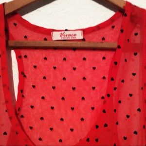 Black little hearts printed on this cute red tank top with a scooped neck and razor back. It’s sheer and flows beautifully. Great for Valentine’s Day !🖤🖤