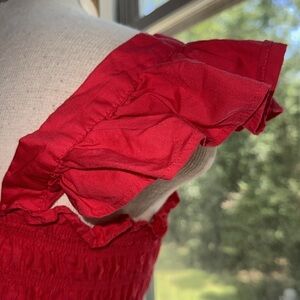 Vibrant red blouse with smocked bodice. Features playful ruffle details. Ideal for casual outings.