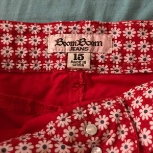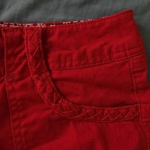Red shorts with detailed pocket border and daisy print waist lining inside shorts.