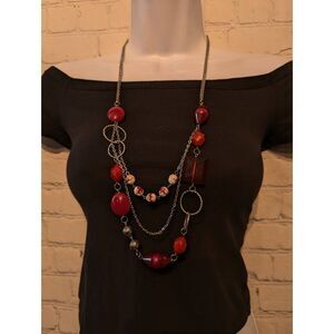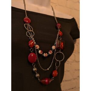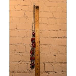 17" Red & silver, beaded & layered, long dangling statement necklace with matching earrings. In excellent condition. Measurements in pictures.