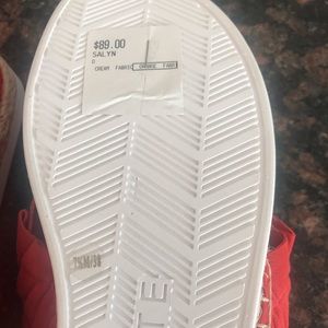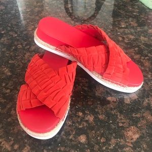 1. State reddish-orange slides for casual or semi dressy. Fits more like a size 7. Ribbon like cross straps are a brushed suede. 1.5 in heel