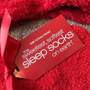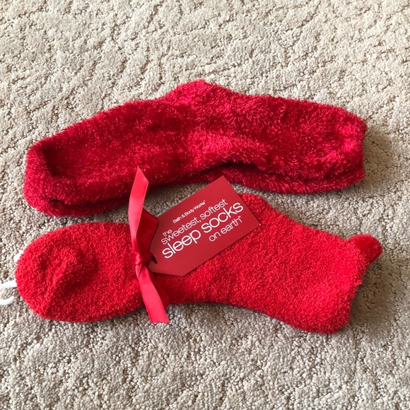 Red socks one is sleep socks and the other is a fluffy fabric. Both stretch.