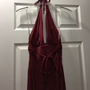 Perfect for New Year's Eve or formal event! Floor length scarlet red, sparkly halter dress with open back and v-neck front. Ruched waist. Only worn twice.