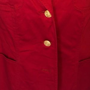 Liz Claiborne red stretch fitted suit jacket. Missing one gold button on front as shown in picture.