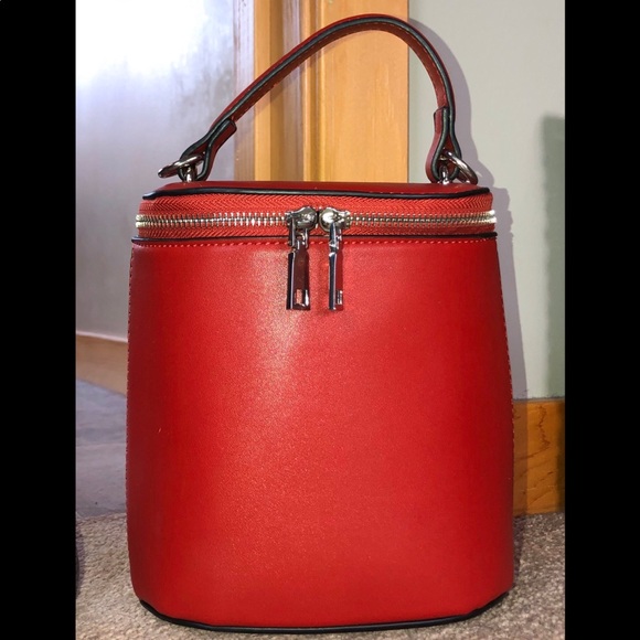 Adorable red mini satchel. Structured. Silver zippers long strap included. Crossbody or handbag style.