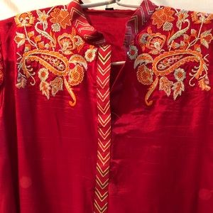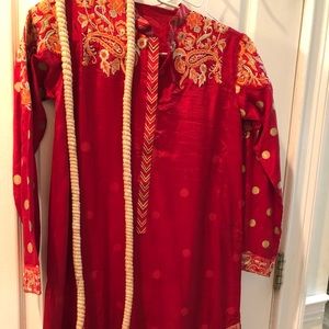 Red suit with embroidery. Comes with scarf and pants. Polyester. Size 38 in j. teens
