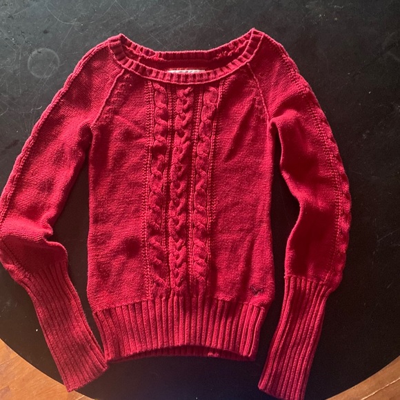 Red long sleeve sweater. No pulled that I can see. Good used condition. Thick material.