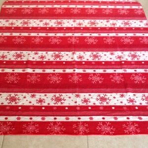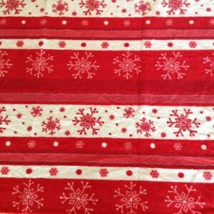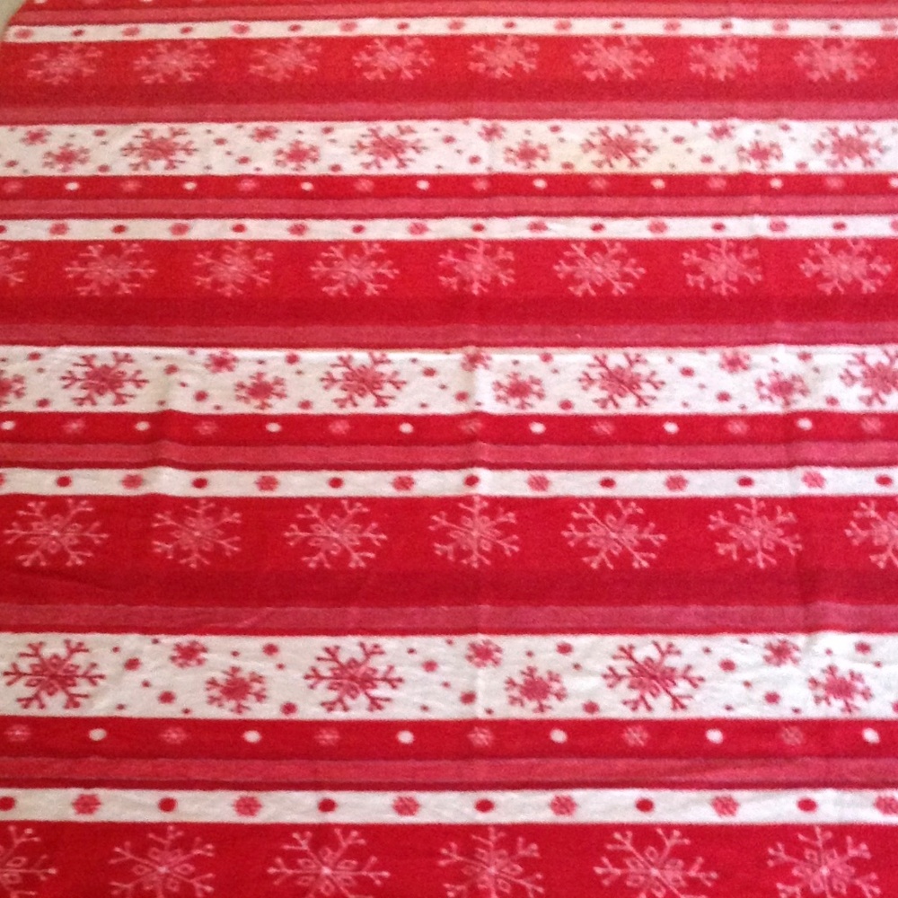 Red throw/lap blanket with large and small snowflake designs. 100% polyester. 58"long x 50" wide. Fun for holidays or any decor. Very soft and very lightweight.
