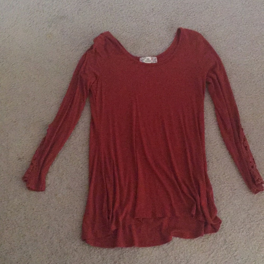 Long sleeve red/maroon top. Design on sleeves.
