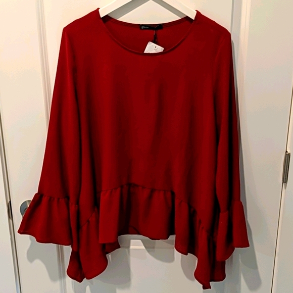 Asymmetrical peplum style top with bell sleeves. Beautiful red wine color. Purchased from Nordstrom.